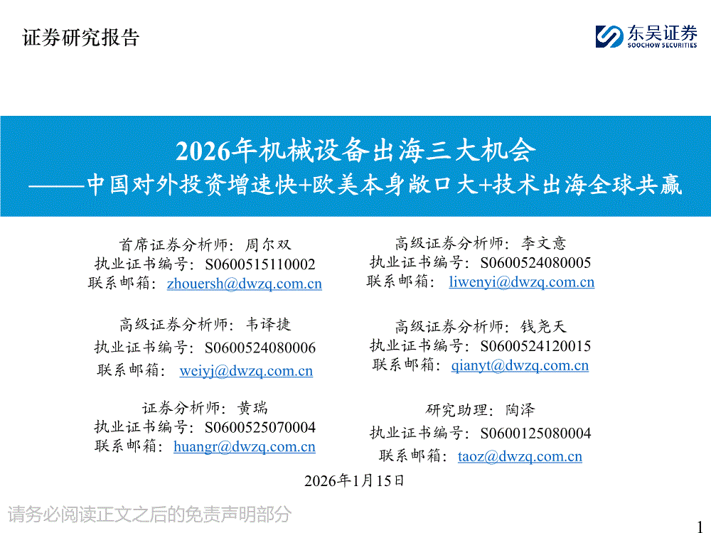 机械设备行业:东吴证券-2026年机械设备行业出海三大机会——中国对外投资增速快+欧美本身敞口大+技术出海全球共赢-260115