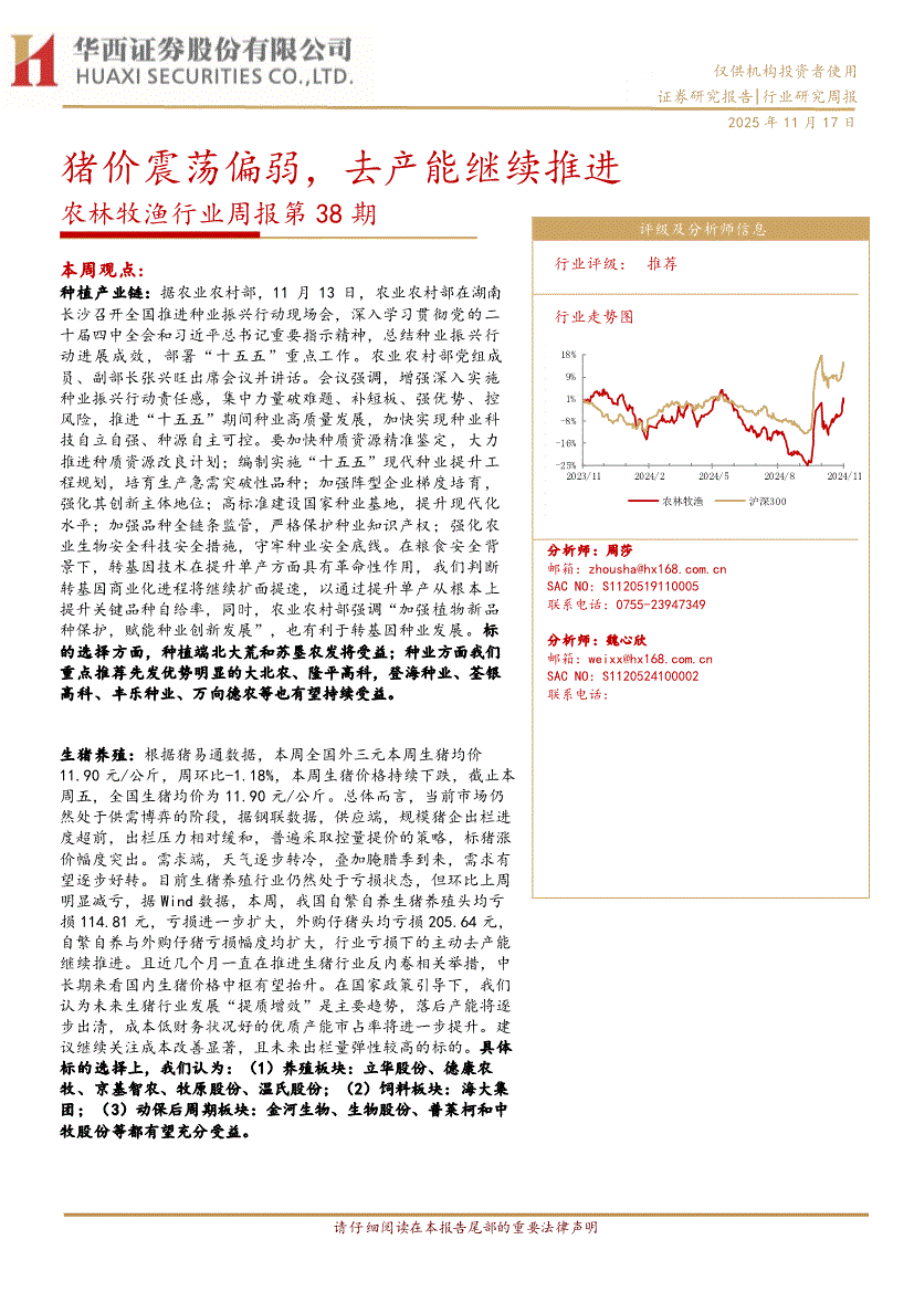 农林牧渔行业:华西证券-农林牧渔行业周报第38期:猪价震荡偏弱,去产能继续推进-251117