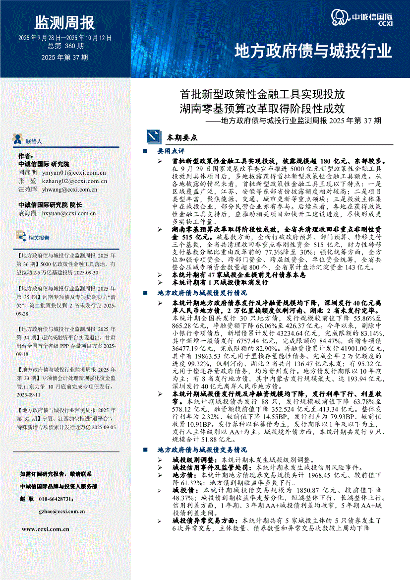中诚信国际-地方政府债与城投行业监测周报2025年第37期:首批新型政策性金融工具实现投放,湖南零基预算改革取得阶段性成效-251012