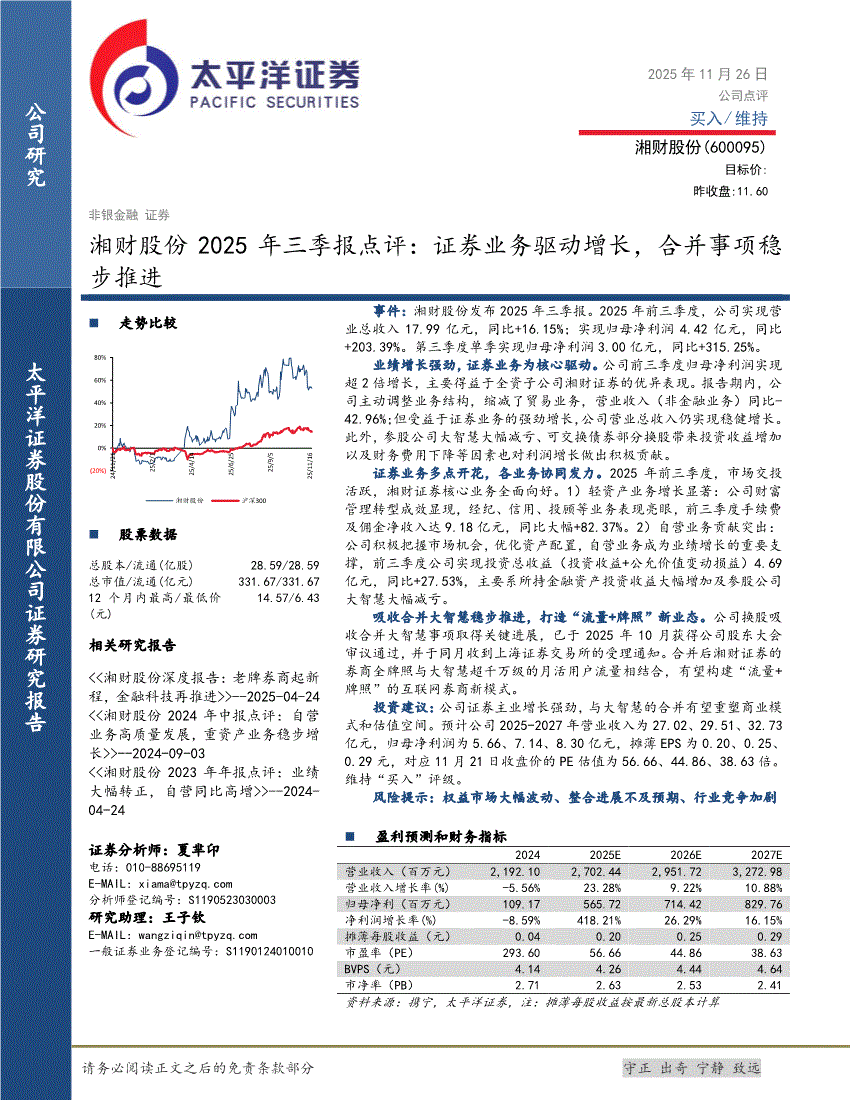 湘财股份:太平洋证券-湘财股份-600095-2025年三季报点评:证券业务驱动增长,合并事项稳步推进-251126