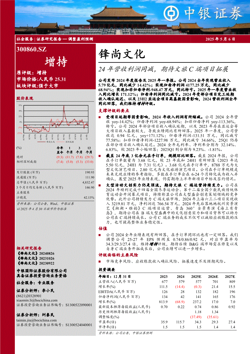 锋尚文化:中银国际-锋尚文化-300860-24年营收利润同减,期待文旅C端项目拓展-250506