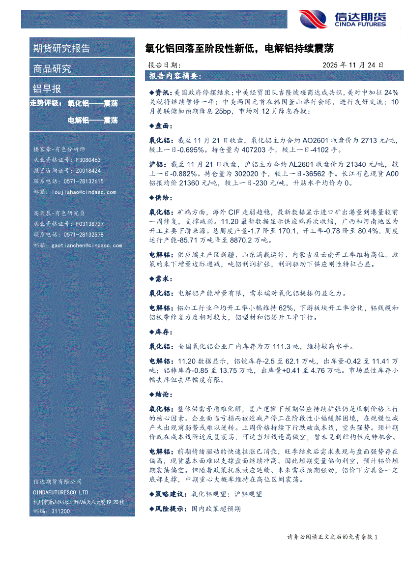 信达期货-铝早报:氧化铝回落至阶段性新低,电解铝持续震荡-251124