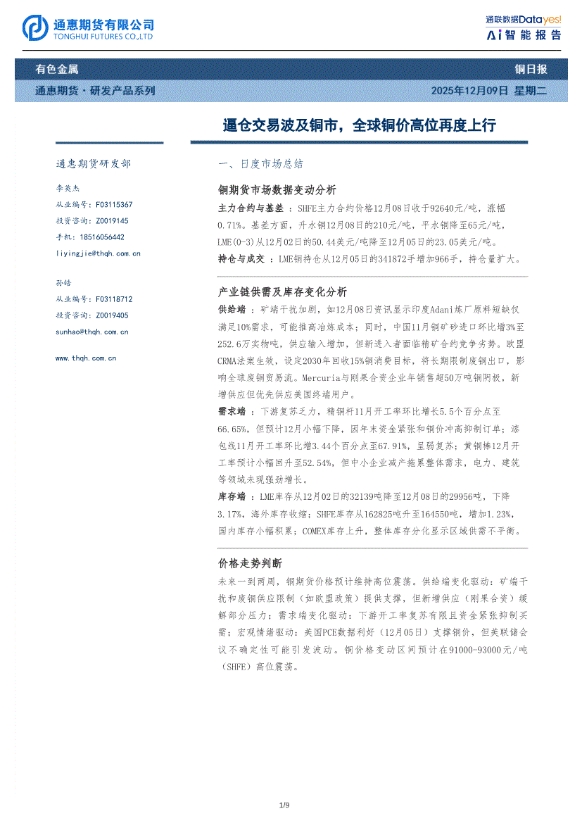 通惠期货-铜日报:逼仓交易波及铜市,全球铜价高位再度上行-251209