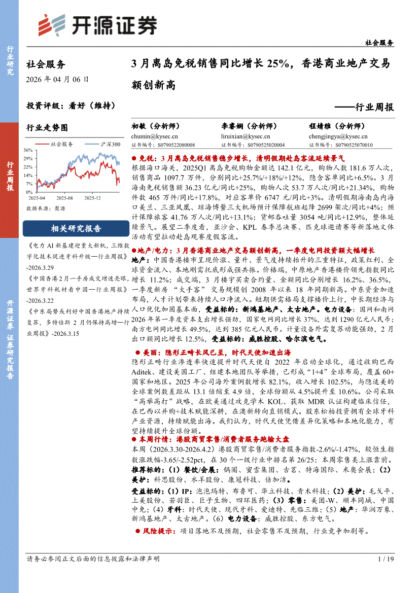 社会服务行业:开源证券-社会服务行业周报:3月离岛免税销售同比增长25%,香港商业地产交易额创新高-260406