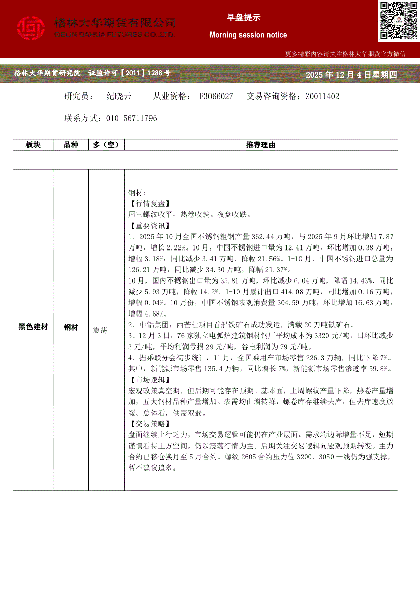 格林大华期货-早盘提示:钢材-251204