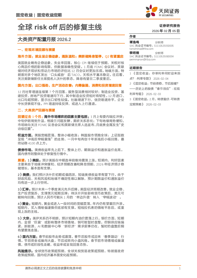 天风证券-大类资产配置月报2026.2:全球risk off后的修复主线-260205