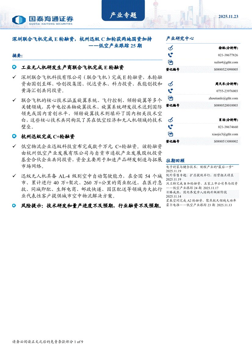 国泰海通证券-产业专题低空产业跟踪25期:深圳联合飞机完成E轮融资,杭州迅蚁C加轮获两地国资加持-251123