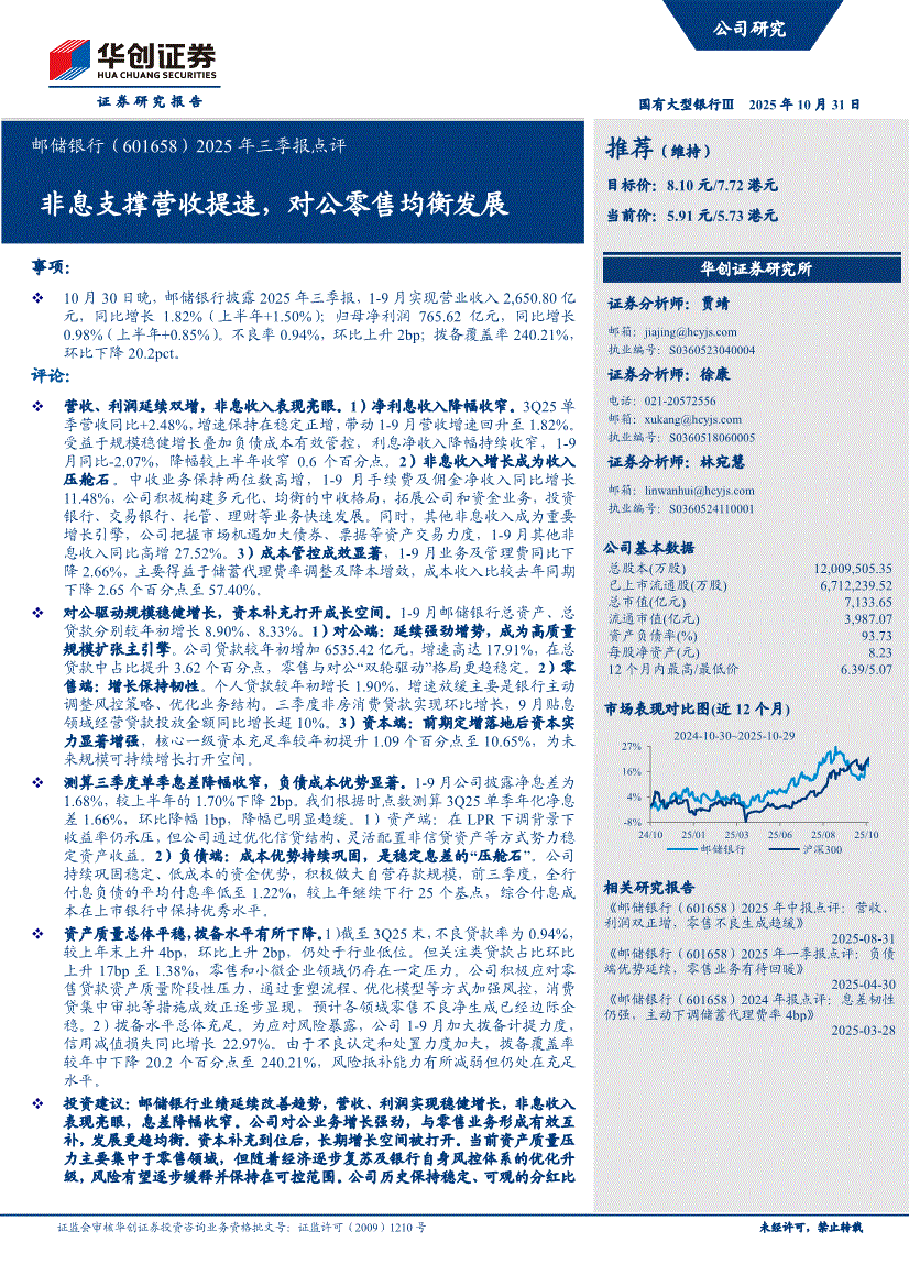 邮储银行:华创证券-邮储银行-601658-2025年三季报点评:非息支撑营收提速,对公零售均衡发展-251031