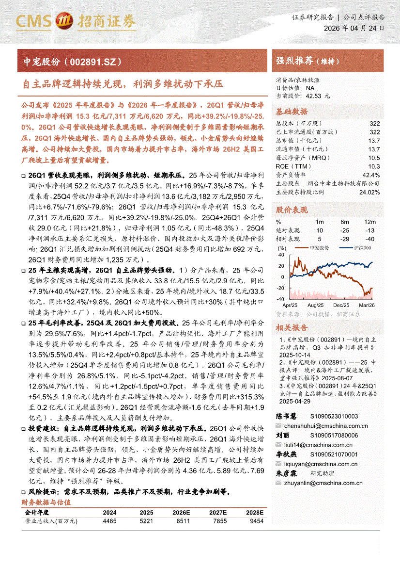 中宠股份:招商证券-中宠股份-002891-自主品牌逻辑持续兑现,利润多维扰动下承压-260424