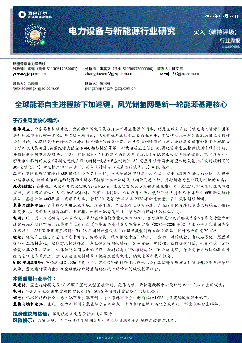 电力设备与新能源行业:国金证券-电力设备与新能源行业周报:全球能源自主进程按下加速键,风光储氢网是新一轮能源基建核心-260322