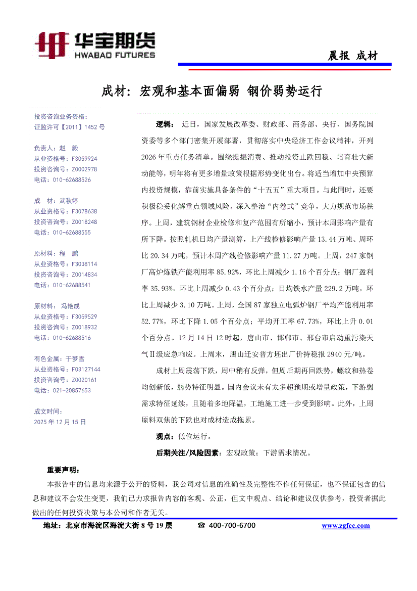 华宝期货-成材:宏观和基本面偏弱,钢价弱势运行-251215