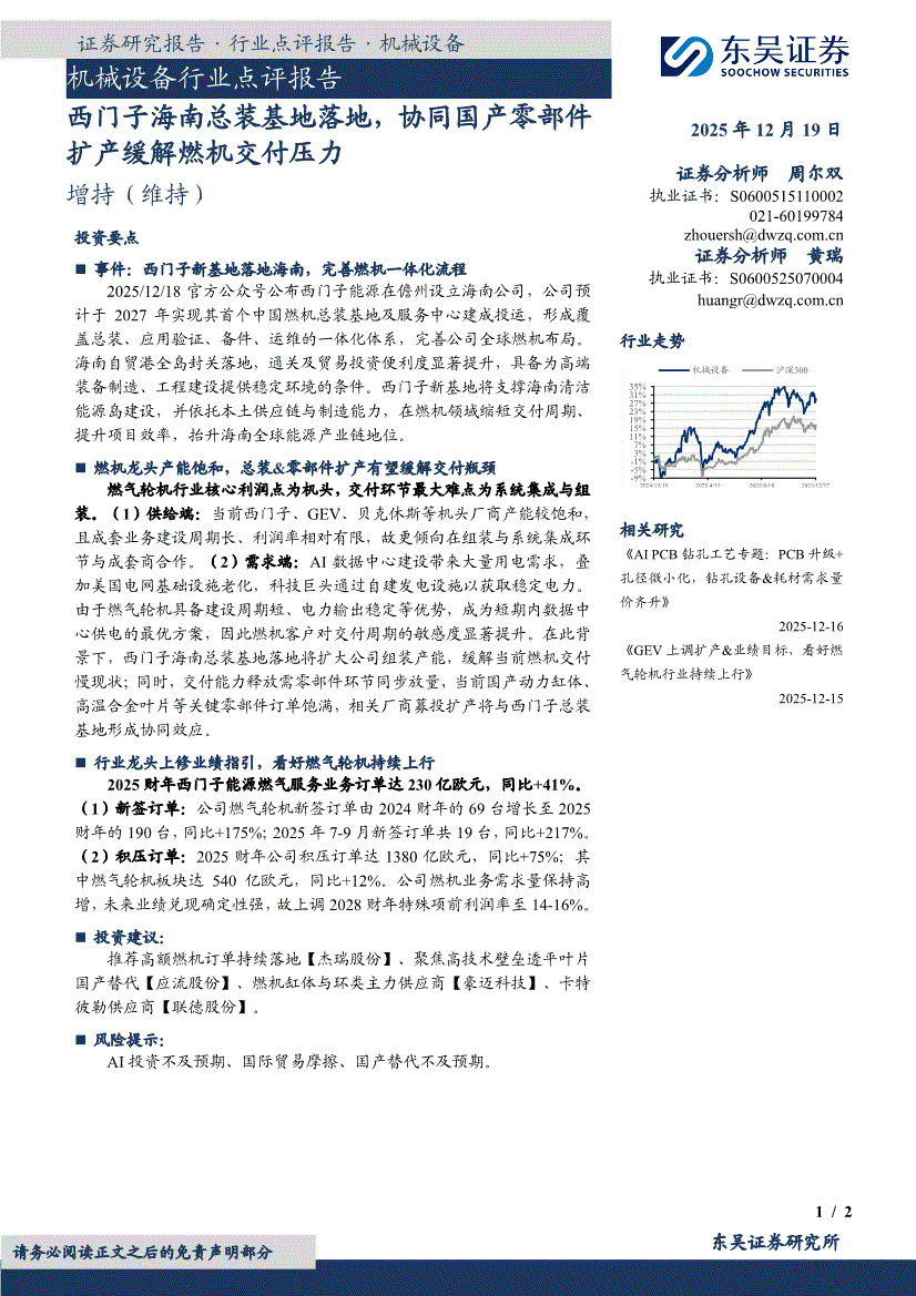 机械设备行业:东吴证券-机械设备行业点评报告:西门子海南总装基地落地,协同国产零部件扩产缓解燃机交付压力-251219