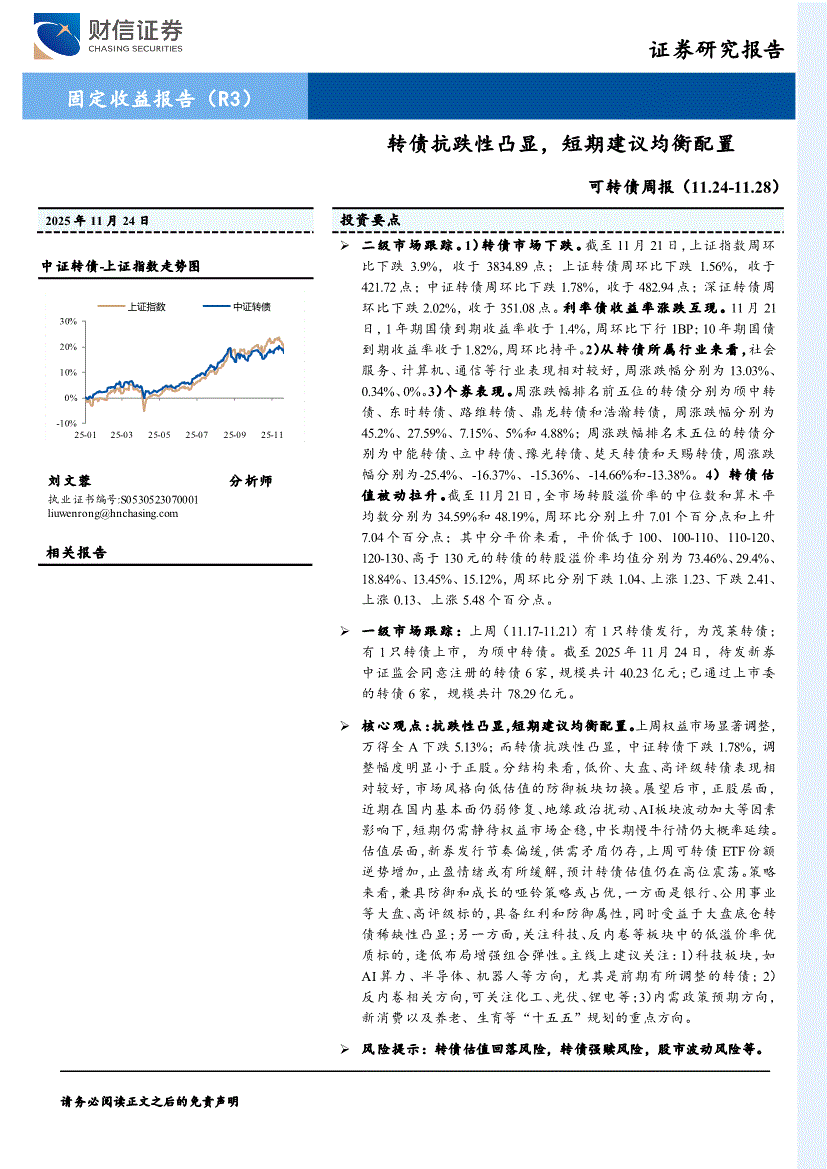 财信证券-可转债周报:转债抗跌性凸显,短期建议均衡配置-251124