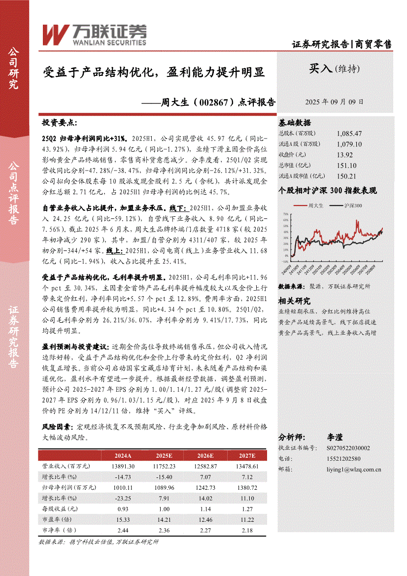 周大生:万联证券-周大生-002867-点评报告:受益于产品结构优化,盈利能力提升明显-250909