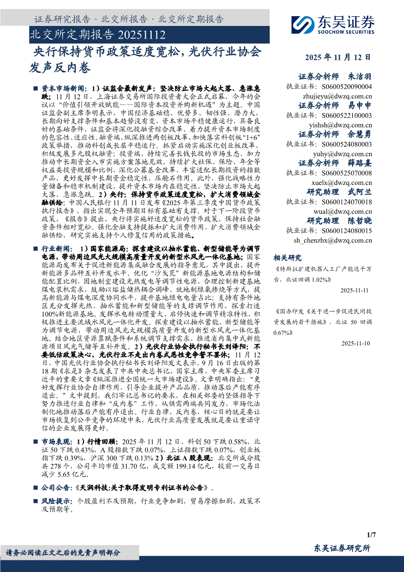 东吴证券-北交所定期报告:央行保持货币政策适度宽松,光伏行业协会发声反内卷-251112