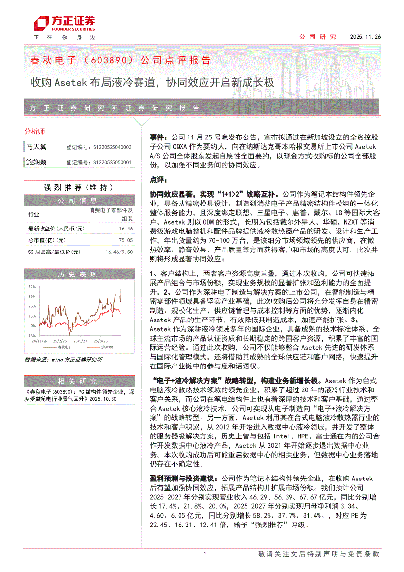 春秋电子:方正证券-春秋电子-603890-公司点评报告:收购Asetek布局液冷赛道,协同效应开启新成长极-251126