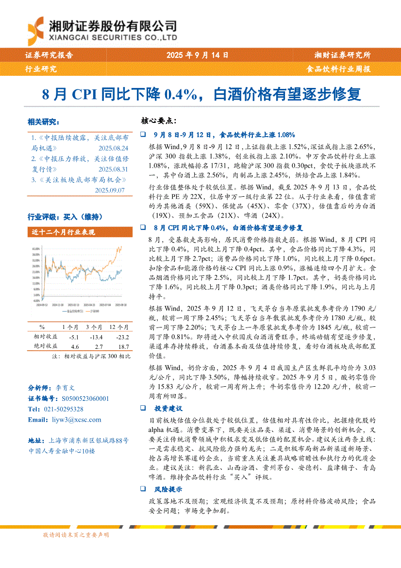 食品饮料行业:湘财证券-食品饮料行业周报:8月CPI同比下降0.4%,白酒价格有望逐步修复-250914
