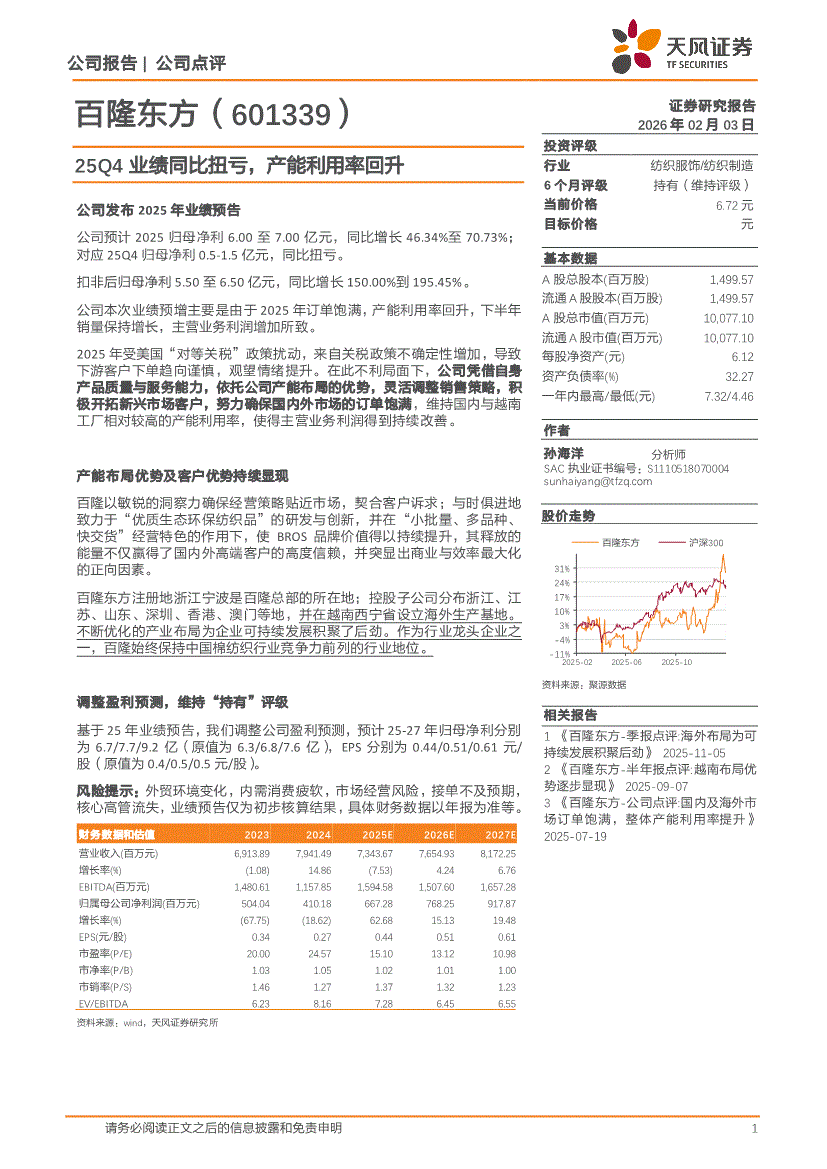 百隆东方:天风证券-百隆东方-601339-25Q4业绩同比扭亏,产能利用率回升-260203