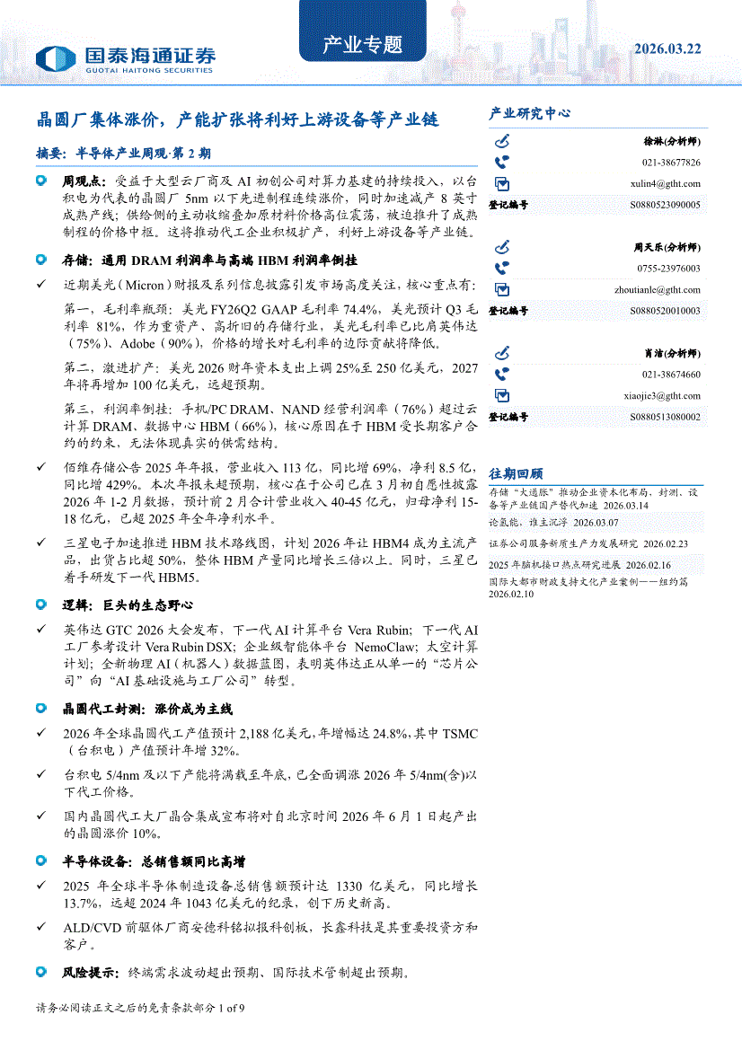国泰海通证券-产业专题:晶圆厂集体涨价,产能扩张将利好上游设备等产业链-260322