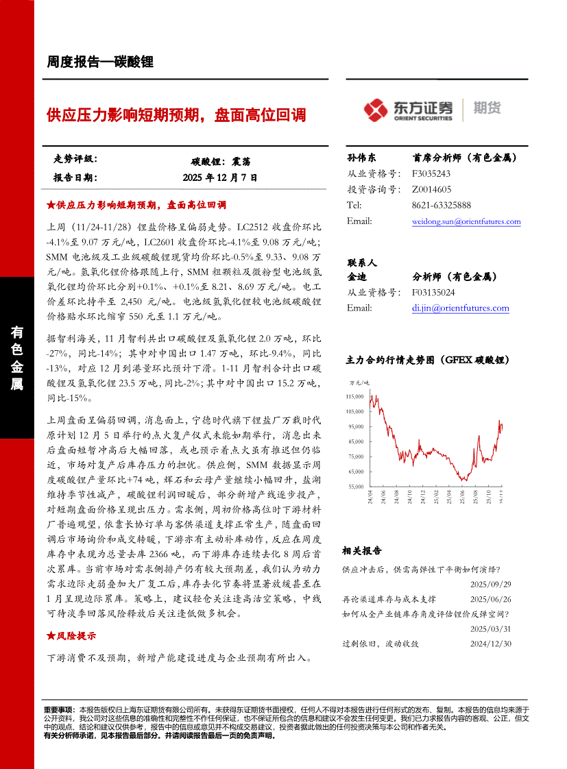 东证期货-周度报告—碳酸锂:供应压力影响短期预期,盘面高位回调-251207