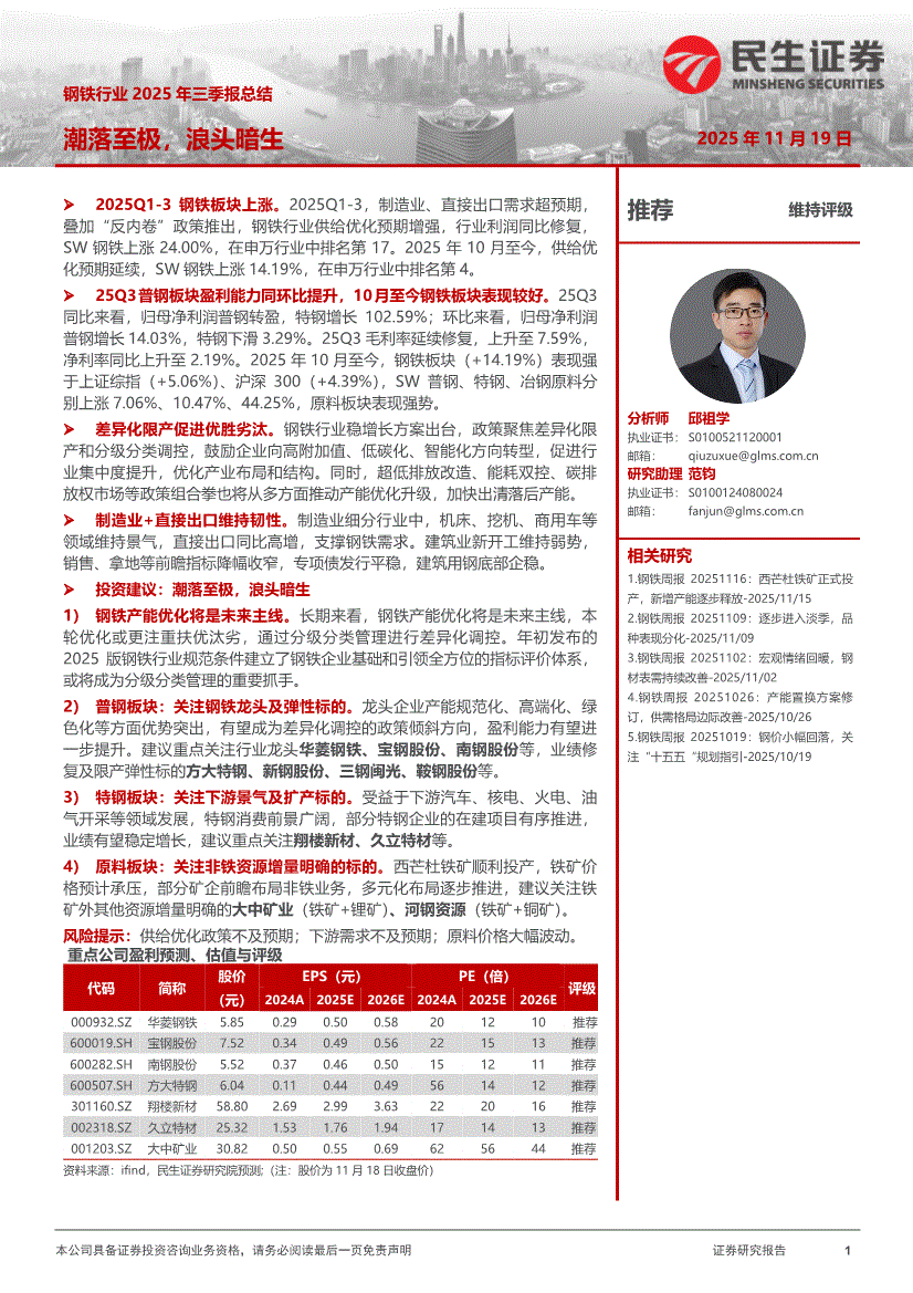 钢铁行业:民生证券-钢铁行业2025年三季报总结:潮落至极,浪头暗生-251119