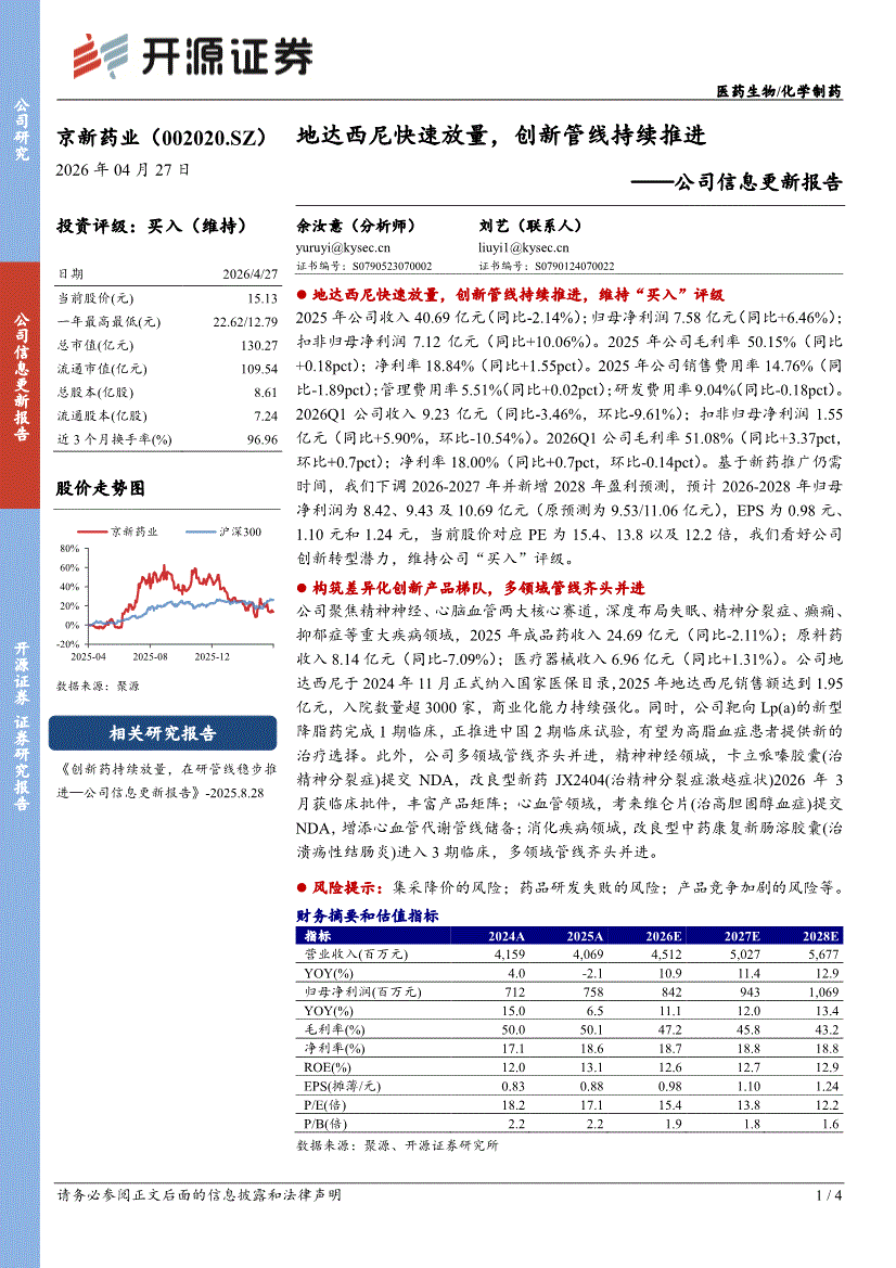 京新药业:开源证券-京新药业-002020-公司信息更新报告:地达西尼快速放量,创新管线持续推进-260427