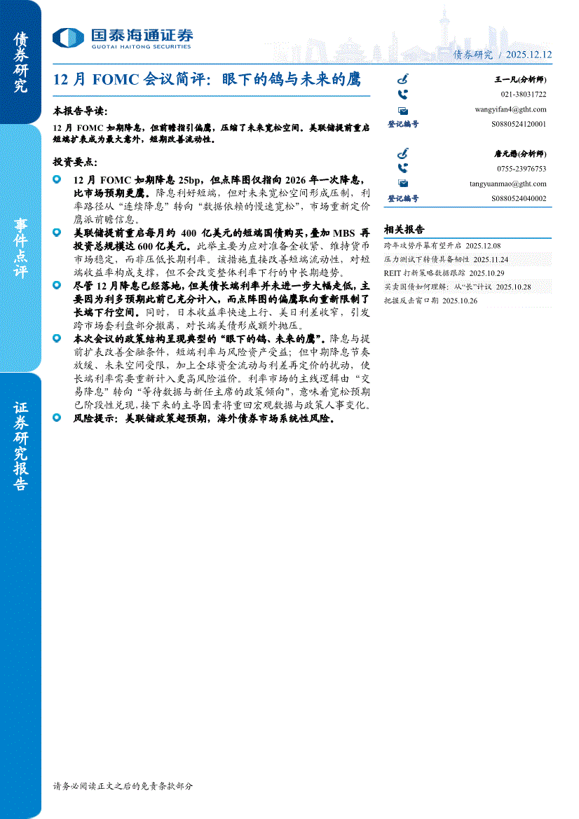 国泰海通证券-12月FOMC会议简评:眼下的鸽与未来的鹰-251212