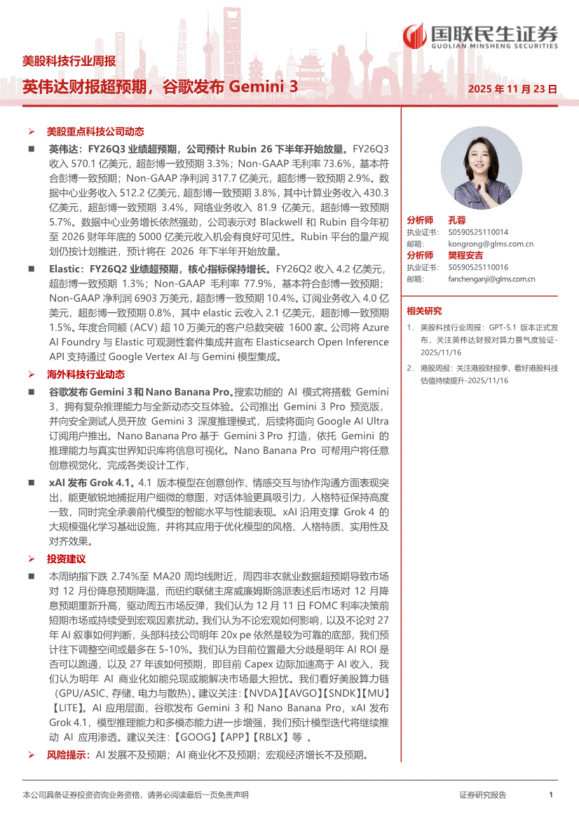 科技行业:国联民生证券-美股科技行业周报:英伟达财报超预期,谷歌发布Gemini3-251123