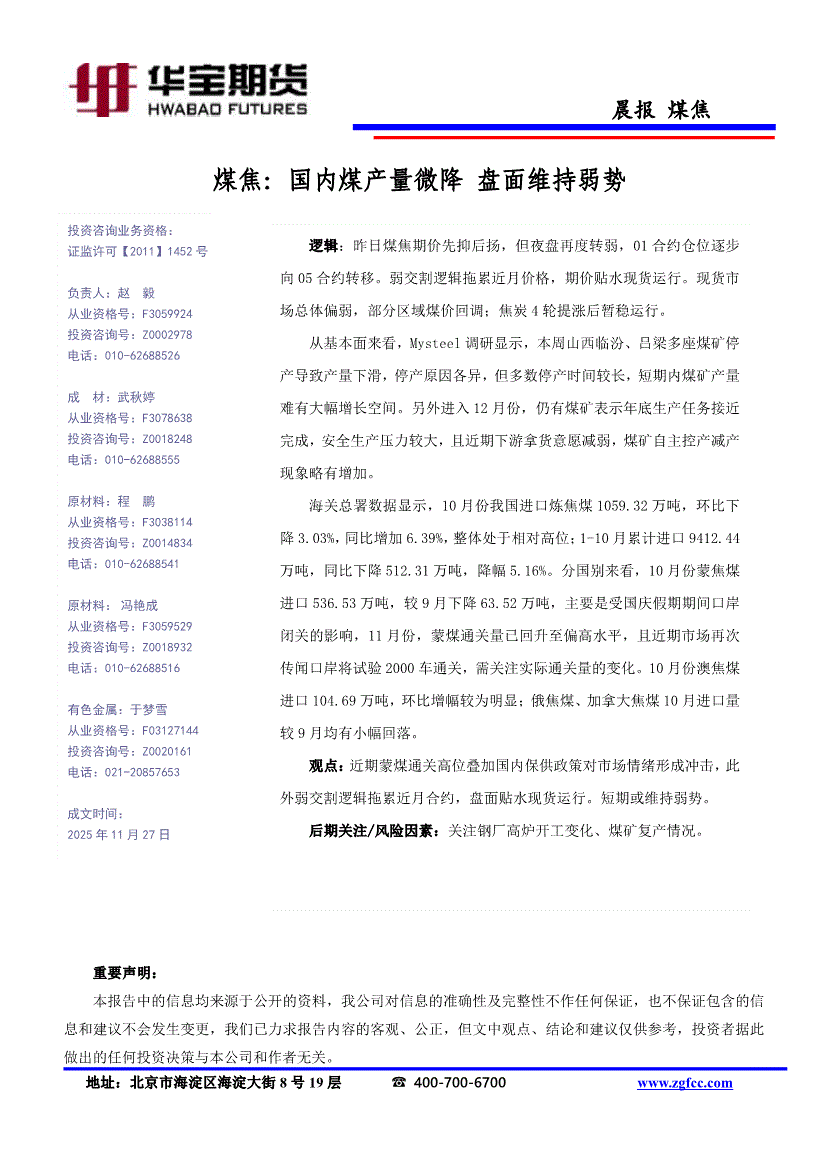 华宝期货-煤焦:国内煤产量微降,盘面维持弱势-251127