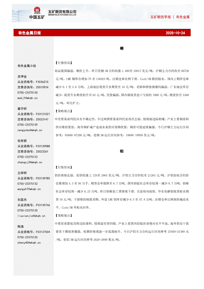 五矿期货-铜周报:中美经贸谈判变化左右市场情绪-251018