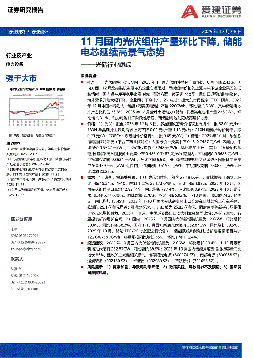 光储行业:爱建证券-光储行业跟踪:11月国内光伏组件产量环比下降,储能电芯延续高景气态势-251208