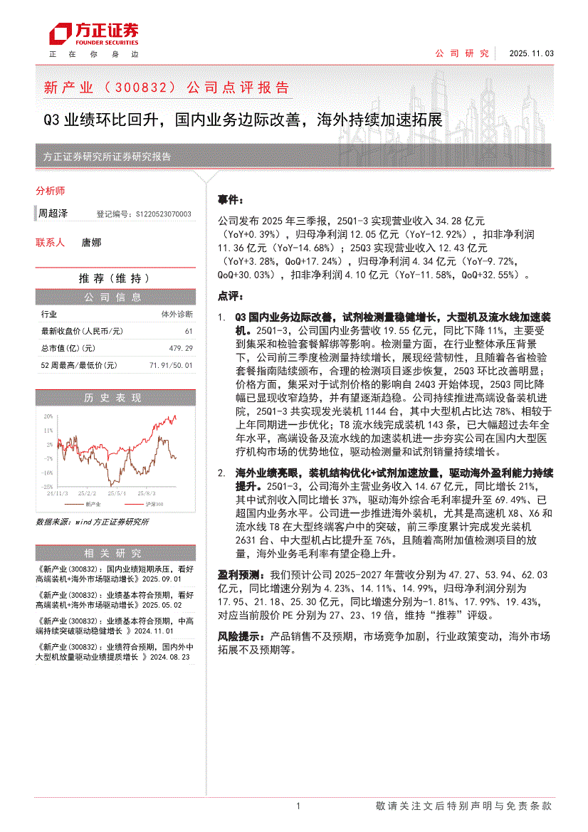 新产业:方正证券-新产业-300832-公司点评报告:Q3业绩环比回升,国内业务边际改善,海外持续加速拓展-251103