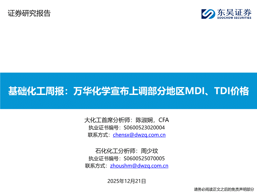 基础化工行业:东吴证券-基础化工行业周报:万华化学宣布上调部分地区MDI、TDI价格-251221