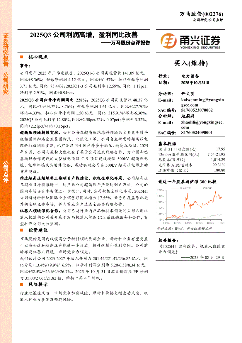 万马股份:甬兴证券-万马股份-002276-点评报告:2025Q3公司利润高增,盈利同比改善-251031
