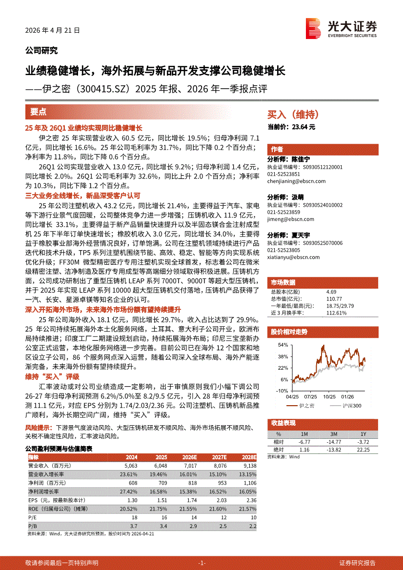 伊之密:光大证券-伊之密-300415-2025年报、2026年一季报点评:业绩稳健增长,海外拓展与新品开发支撑公司稳健增长-260421