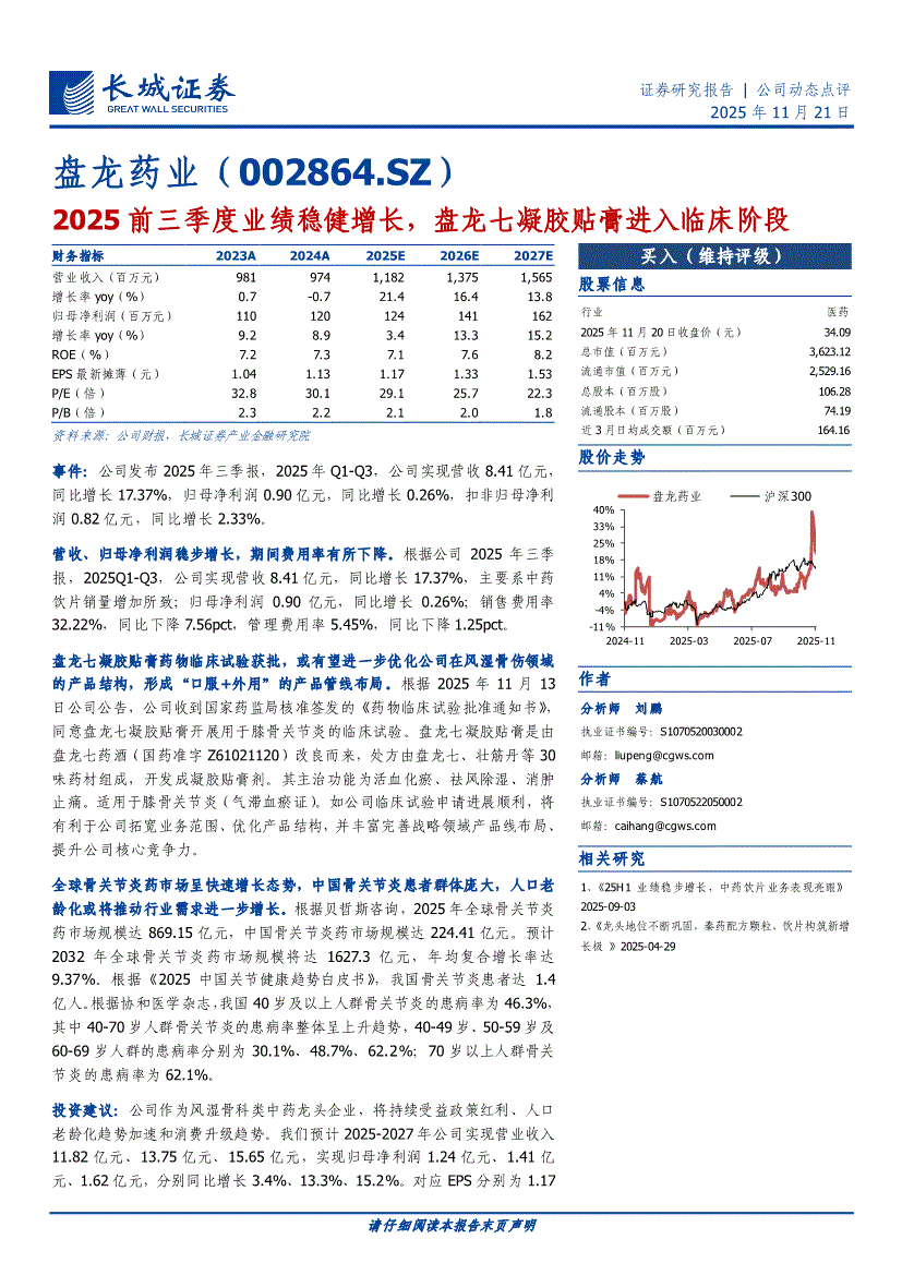 盘龙药业:长城证券-盘龙药业-002864-2025前三季度业绩稳健增长,盘龙七凝胶贴膏进入临床阶段-251121