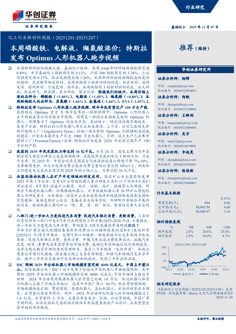 化工行业:华创证券-化工行业新材料周报:本周磷酸铁、电解液、缬氨酸涨价;特斯拉发布Optimus人形机器人跑步视频-251207