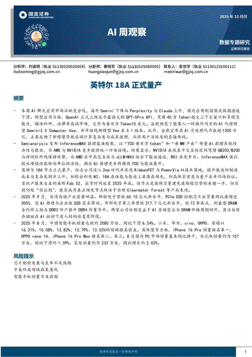 AI行业:国金证券-AI行业周观察:英特尔18A正式量产-251012