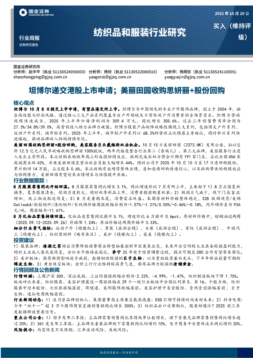 纺织品和服装行业:国金证券-纺织品和服装行业研究周报:坦博尔递交港股上市申请;美丽田园收购思妍丽+股份回购-251019