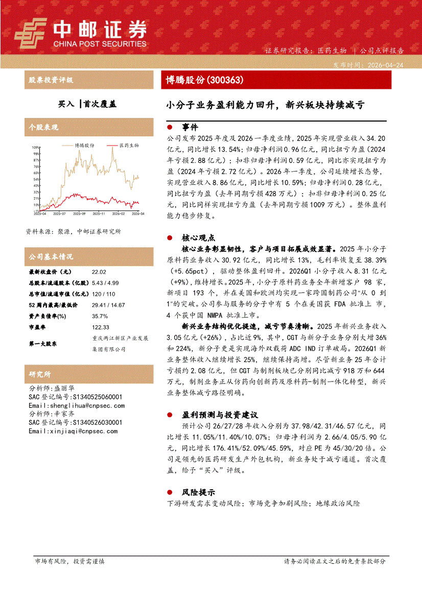 博腾股份:中邮证券-博腾股份-300363-小分子业务盈利能力回升,新兴板块持续减亏-260424