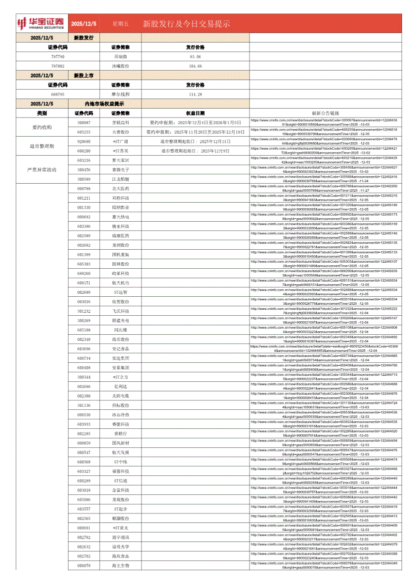 华宝证券-新股发行及今日交易提示-251205