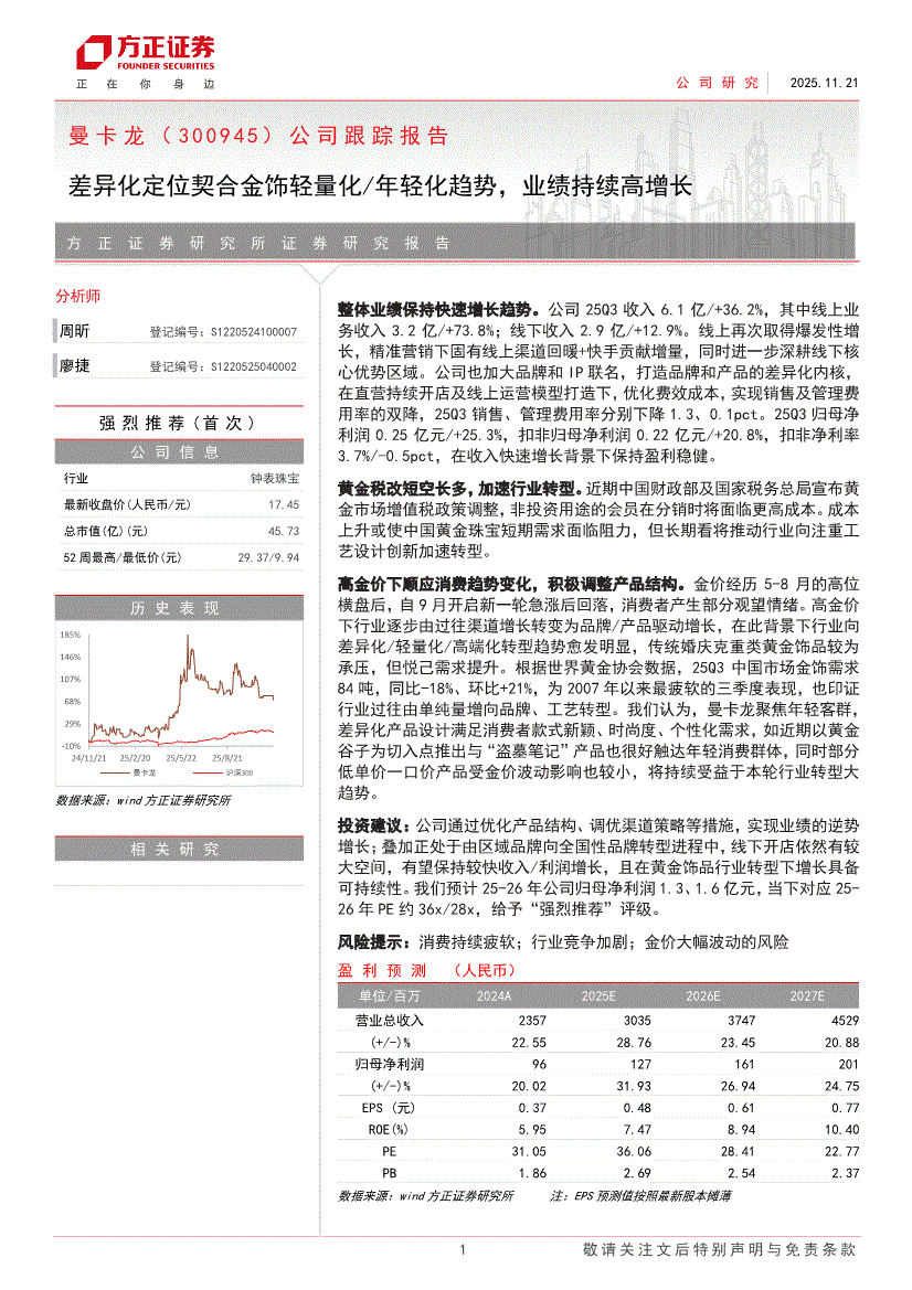 曼卡龙:方正证券-曼卡龙-300945-公司跟踪报告:差异化定位契合金饰轻量化/年轻化趋势,业绩持续高增长-251121