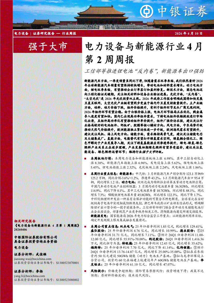 电力设备与新能源行业:中银国际-电力设备与新能源行业4月第2周周报:工信部等推进锂电池“反内卷”,新能源车出口强劲-260412