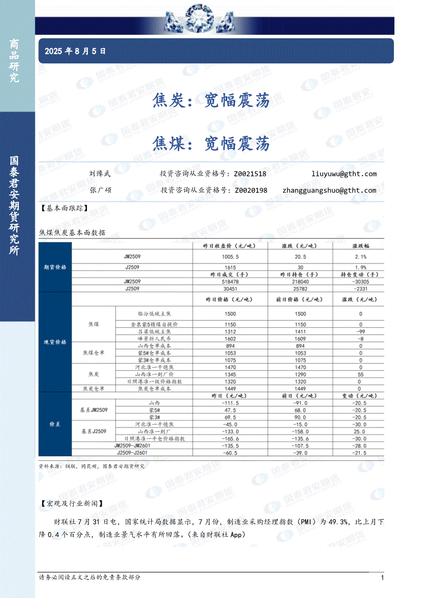 国泰君安期货-焦炭:宽幅震荡,焦煤,宽幅震荡-250805