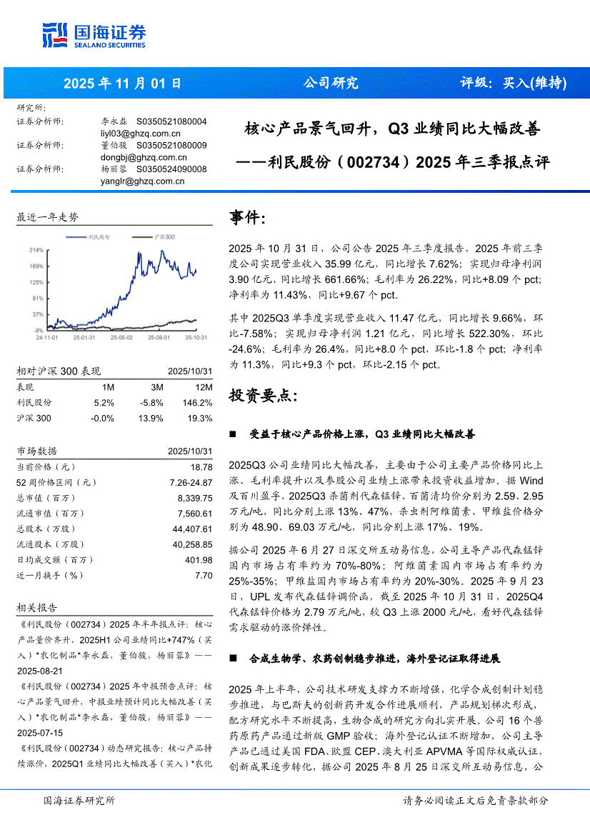 利民股份:国海证券-利民股份-002734-2025年三季报点评:核心产品景气回升,Q3业绩同比大幅改善-251101