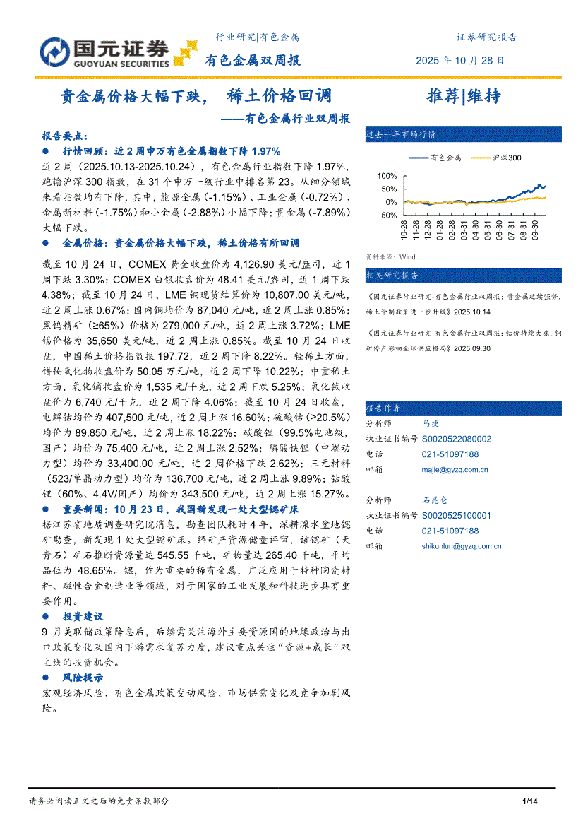 国元证券-有色金属行业双周报:贵金属价格大幅下跌,稀土价格回调-251028