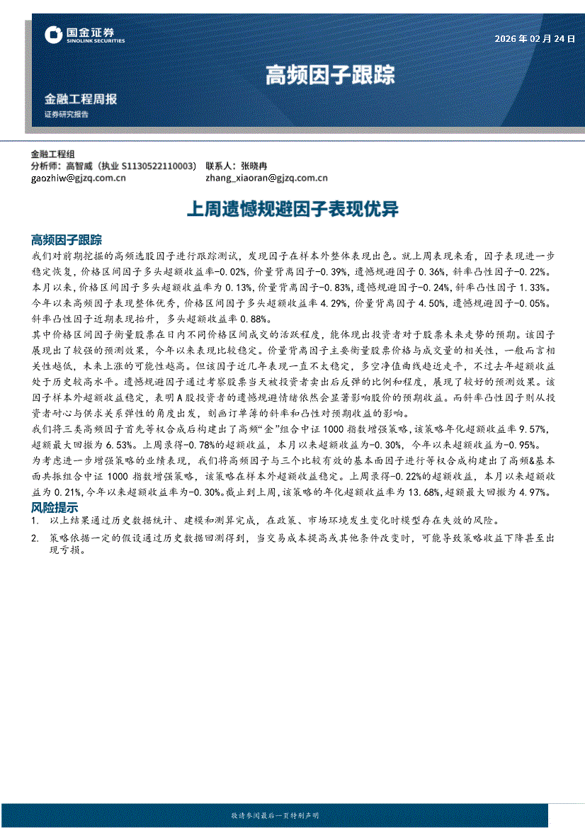 国金证券-高频因子跟踪:上周遗憾规避因子表现优异-260224
