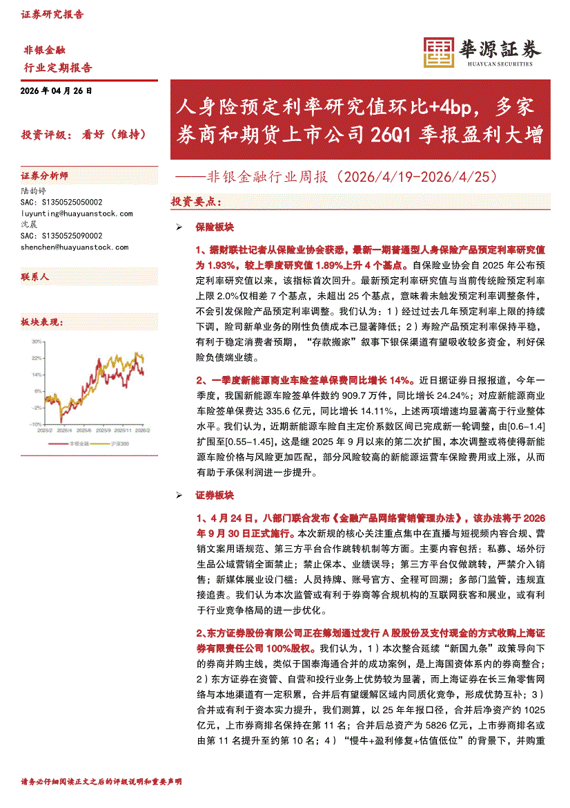 华源证券-非银金融行业周报:人身险预定利率研究值环比+4bp,多家券商和期货上市公司26Q1季报盈利大增-260426