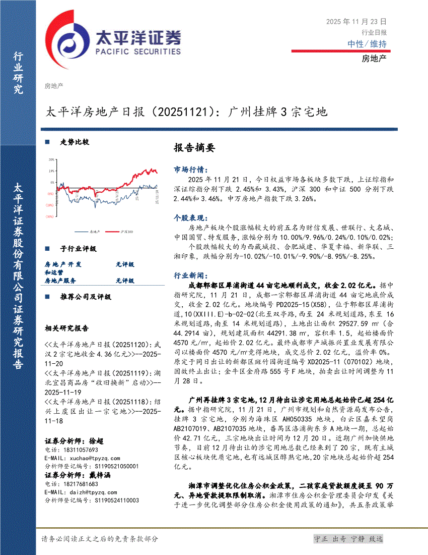 房地产行业:太平洋证券-房地产行业日报:广州挂牌3宗宅地-251123