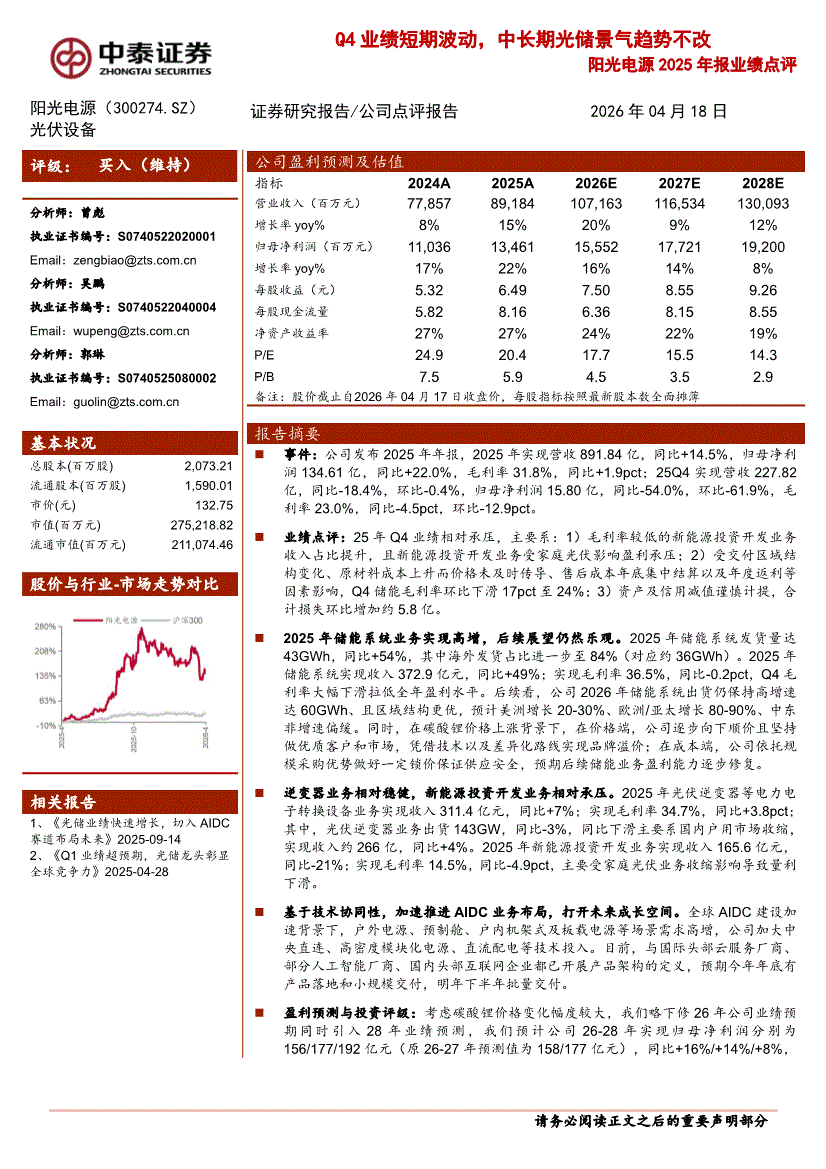 中泰证券-阳光电源-300274-2025年报业绩点评:Q4业绩短期波动,中长期光储景气趋势不改-260418